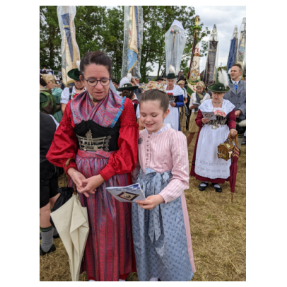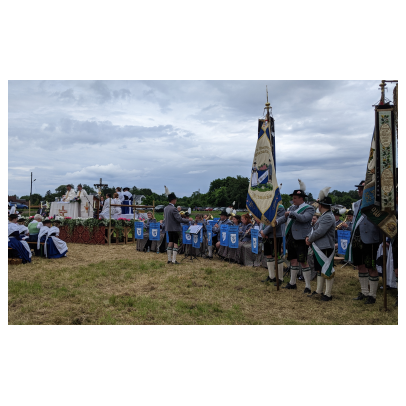 Wikipedia führt 62 Vereine mit rund 8.000 Mitgliedern an, die im Isargau, einem Mitglied des Bayerischen Trachtenverbandes, organisiert sind. Der Gau hat sich zur Aufgabe gemacht, die Miesbacher, Werdenfelser, Berchtesgadener, Jachenauer, Lenggrieser, Ruhpoldinger und Inntaler Gebirgstracht sowie die Dachauer, Dorfener, Markt Schwabener, Wartenberger und die Niederbayerische Volkstracht in ihrer Reinheit zu erhalten und zu fördern. Dass die vielen Trachten- Gesangs- Volksmusik- sowie Jugendgruppen in dem festen Willen vereint sind, gutes altes Brauchtum im Hier und Jetzt publikumswirksam in Szene zu setzen, das haben die Riadastoana aus Feldmoching als Ausrichter eines gigantischen Gaufestes bewiesen. Ein paar Lechler hatten sich Tickets für heißbegehrte Programmpunkte des Festes bereits vor Monaten sichern können, ich habe leider erst am Sonntag mitbekommen, was ich da alles versäumt habe. Naja, Feldkirche, Ehrentänze und der Festzug durch die dicht mit Zuschauern gesäumten Straßen von Feldmoching waren ein sehr schönes Gemeinschaftserlebnis. Der Kilian ging mit dem Taferl den anderen 14 Lechlern voran. Der Florian trug wacker die schwere Fahne fast die ganze Zugstrecke lang und übergab sie erst kurz vor dem Wiedereintreffen am Bierzelt zum Schwenken und Drehen an Martin.